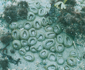 These are sea anemones. The name "anemone" even made the "Most Beautiful Words in the English Language" list. Normally you see anemones as beautiful flower-like creatures in an underwater setting. The above images show the anemones as they appear in their shrunk-down state when the water has receded from the tidepool.